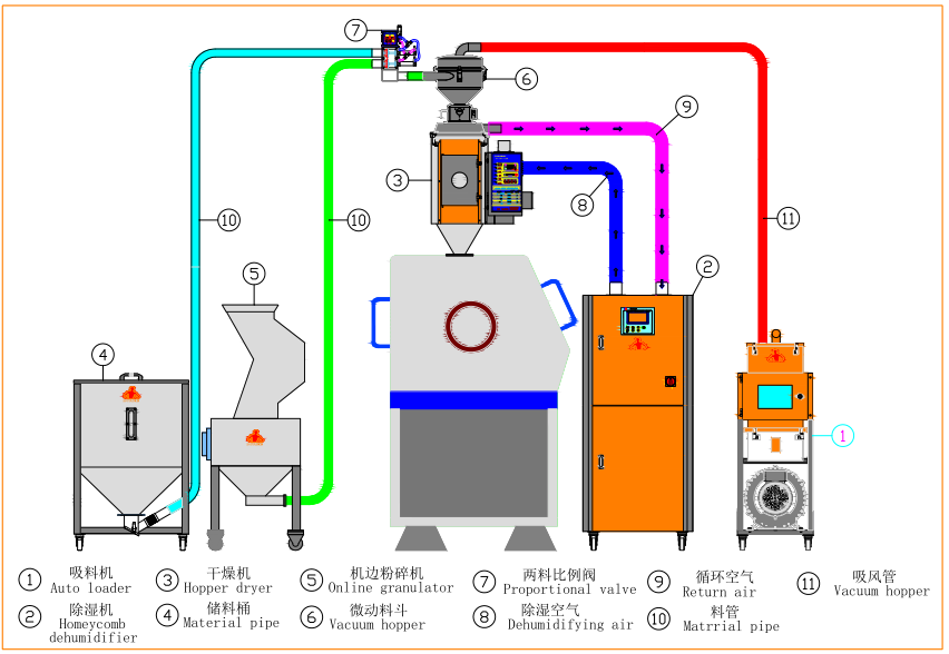 机台的主要用途是与热风式料斗干燥机搭配,对吸湿性较强的工程塑料
