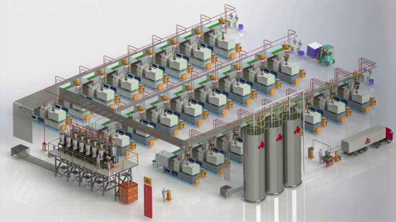 中央供料系统是为注塑车间的塑料产品生产而设计的,实现了不间断无人化连续成型作业。可根据需要改变原料品种、多颜色材料的组合使用方式,实现着色工序的自动化。系统能够以全自动方式再生和使用注口冷料,能够对所有供料设备的控制,并防止了储料仓内阻塞现象的发生,通过设置中央监控台实现全自动化。