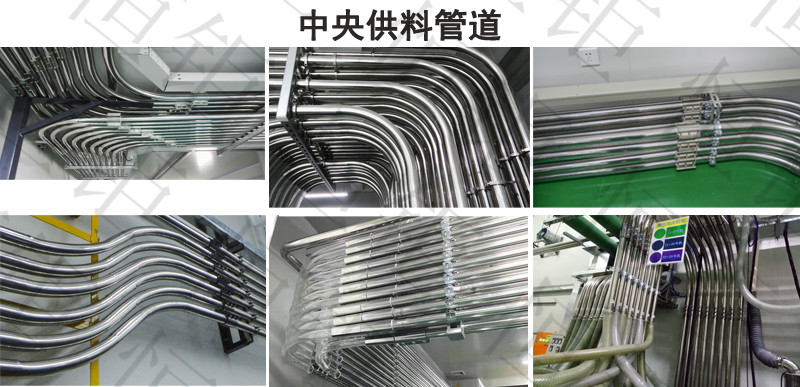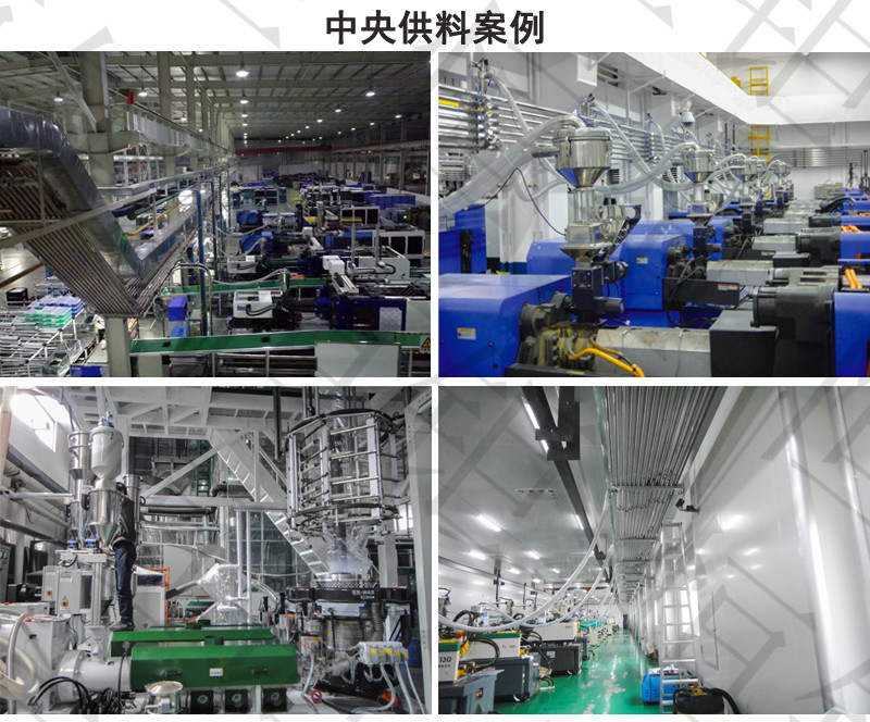 ;中央供料系统采用真空传送方式,通过集中的管路系统将塑料原料从储料罐输送到中央除湿干燥系统,然后将干燥后的原料输送到每台注塑机中。中央供料系统采用“一台机器一根管”的设计方式,保证整个系统的空气对原料进行输送,防止除湿干燥后的原料回潮。